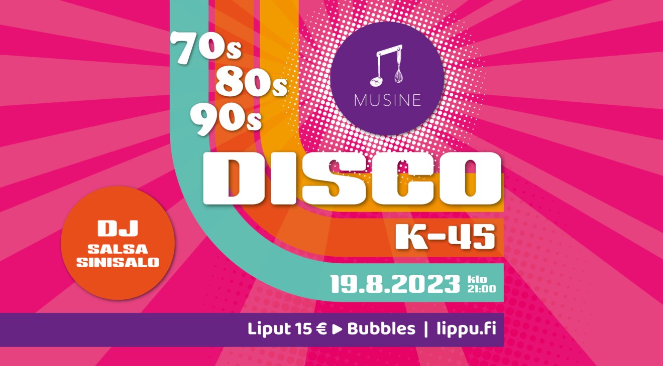 Musinen kristallikruunujen alla K-45 Disco Vol 4. DJ Salsa Sinisalo soittaa 70-, 80- ja 90-luvun parhaita biisejä, jotka saavat varmasti aikaan jalan vipatusta jokaisessa paikallaolijassa.